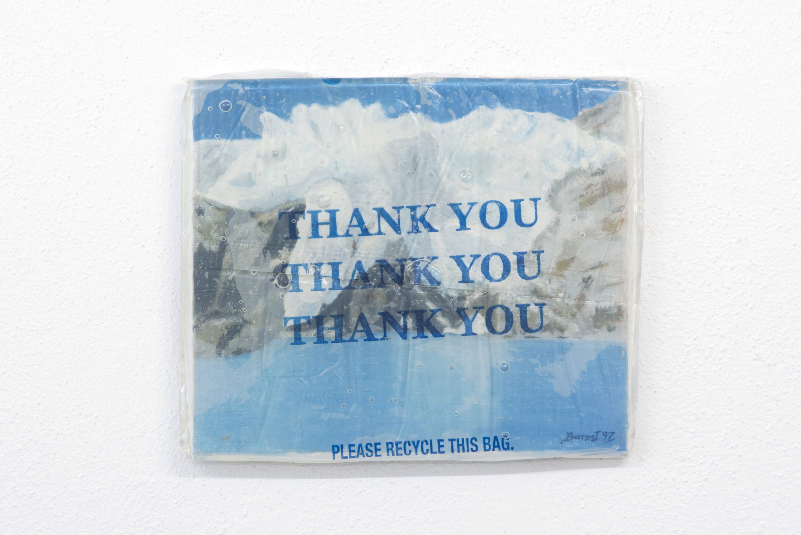 Untitled (THANK YOU THANK YOU THANK YOU), 2018. Epoxy resin, plastic bag, found painting. 30,5 x 37 cm